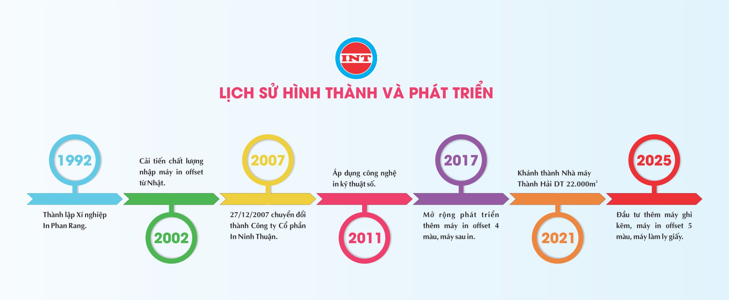Công ty Cổ phần In Ninh Thuận là đơn vị in ấn có bề dày hơn 30 năm tại Ninh Thuận. Tiền thân là Xí nghiệp In Phan Rang (1992), công ty liên tục đổi mới công nghệ: chuyển từ in typo sang in offset (1997), nâng cấp chất lượng với máy offset nhập từ Nhật (2002), và chuyển đổi mô hình thành công ty cổ phần vào ngày 27/12/2007. Từ 2011, doanh nghiệp ứng dụng công nghệ in kỹ thuật số, mở rộng dải dịch vụ và rút ngắn thời gian giao hàng. Đến 2017 và những năm sau, công ty tiếp tục đầu tư thêm máy in offset và máy sau in, từng bước hoàn thiện năng lực sản xuất.